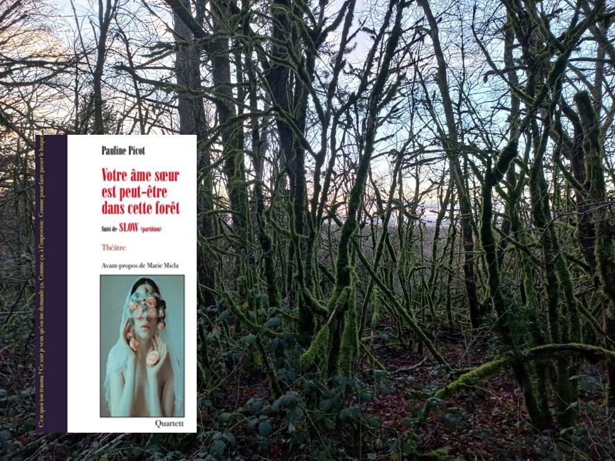 Cette pièce, c’est une salle habillée pour la fête : tables garnies, toasts, verrines, saladiers de punch et verres jetables. Et puis les guirlandes, la musique et les projecteurs lumineux. Bleu – rose – bleu – rose – bleu – rose – bleu – rose pendant que la musique boucle et reboucle telle une bande-son hypnotisante. Nulle âme qui vive dans cette pièce, excepté Marie qui porte « une tenue de fête qui ne lui va pas » et qui remplit la pièce de sa présence et de son flot de parole. D’entrée, Pauline Picot plante le décor qui nous accompagnera tout au long des pages de ce livre. Publié aux éditions Quartett, Votre âme sœur est peut-être dans cette forêt est un monologue de Marie entrecoupé de fréquentes didascalies.