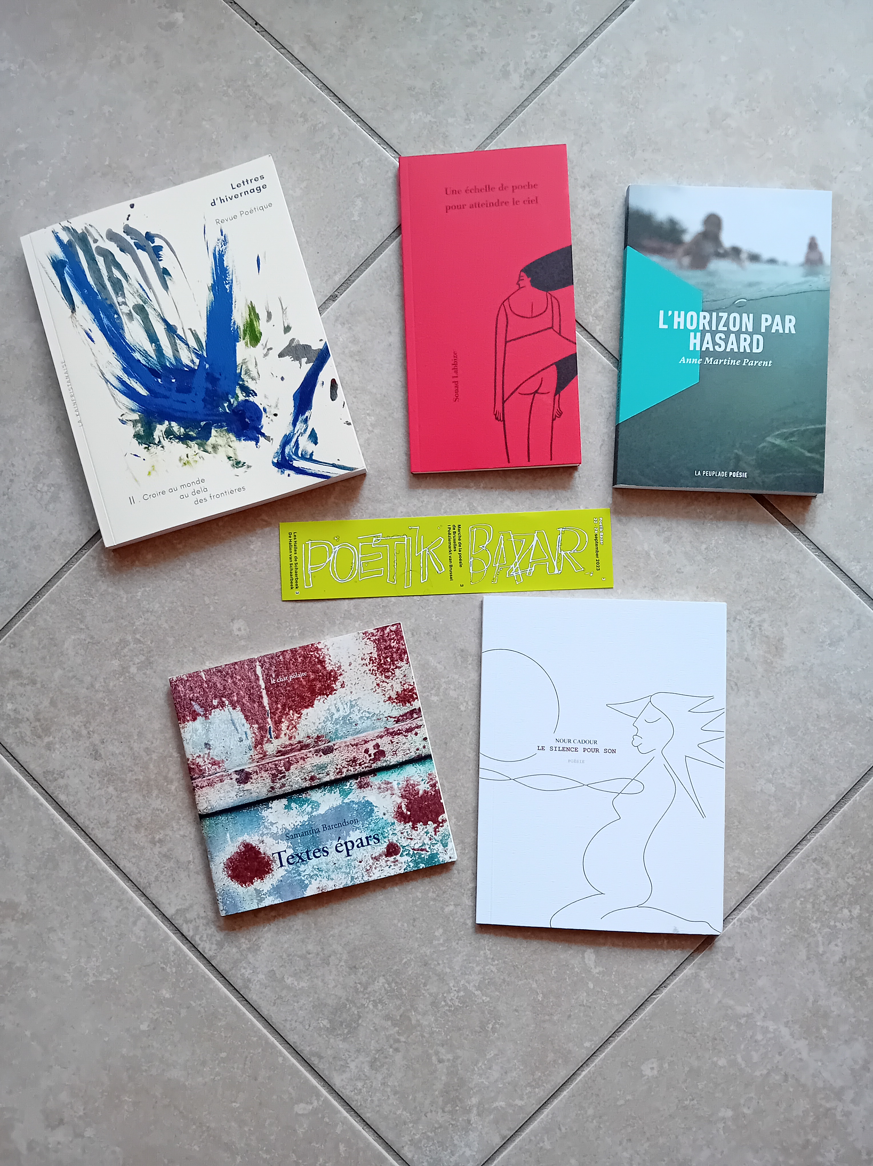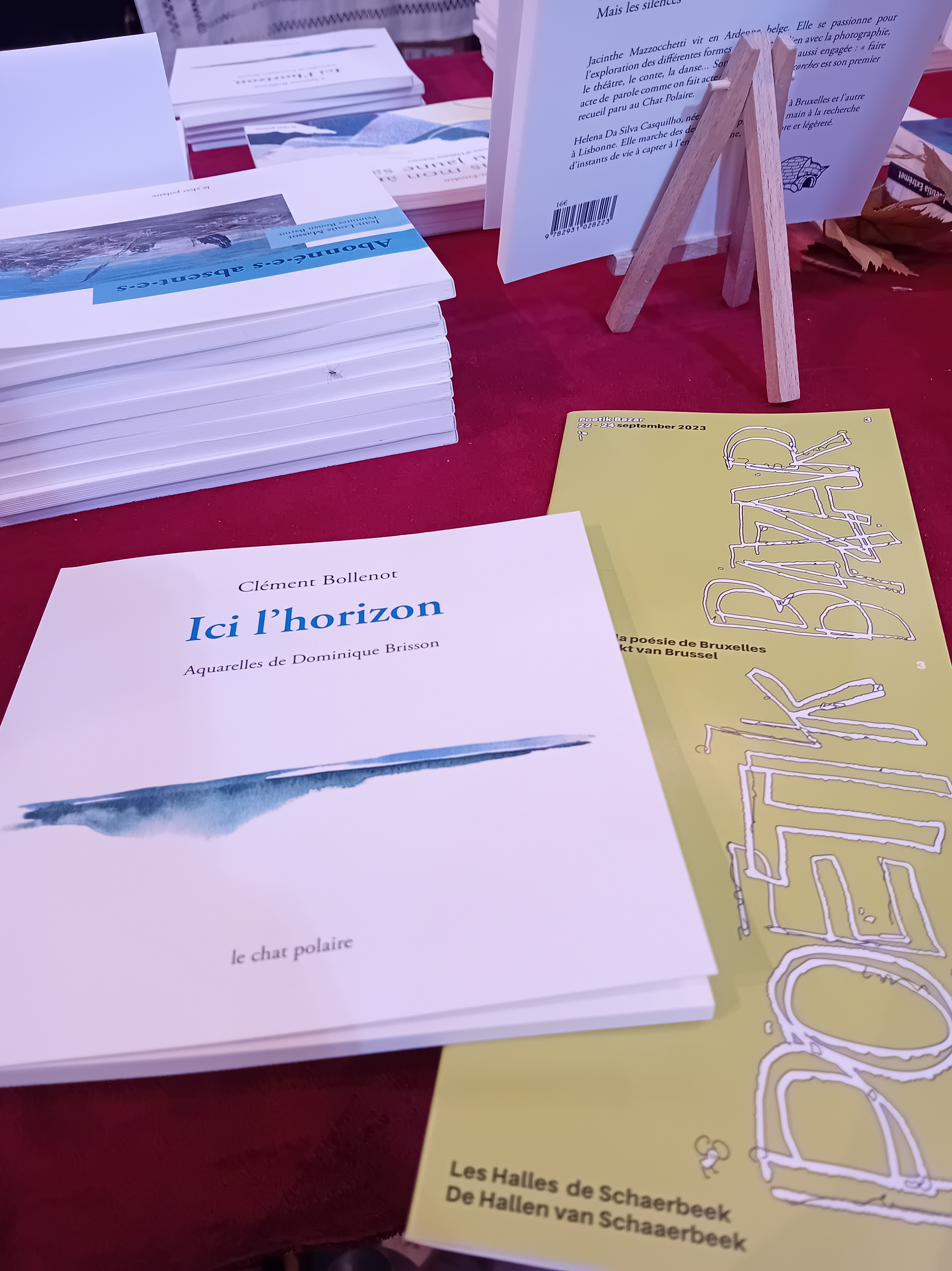 Les 22, 23 et 24 septembre, c’était le Poétik Bazar à Bruxelles, relocalisé cette année aux Halles de Schaerbeek avec une importante programmation. Dans un lieu nouveau, plus proche du centre ville de Bruxelles, les événements se sont succédés dans un cadre agréable, propice aux échanges. Ce fut un excellent weekend où j’ai pu écouter des lectures de poésie, faire de nouvelles rencontres, retrouver des ami.es, acheter quelques livres et découvrir enfin d’encres et de papier Ici l’horizon, mon nouveau recueil publié aux éditions du Chat Polaire. Le livre est tout beau, les textes merveilleusement bien accompagnés par les aquarelles de Dominique Brisson. J’ai eu le plaisir de faire deux séances de dédicaces sous le regard bienveillant de Marie Tafforeau, mon éditrice. Le Poétik Bazar c’était bien, vivement le prochain !