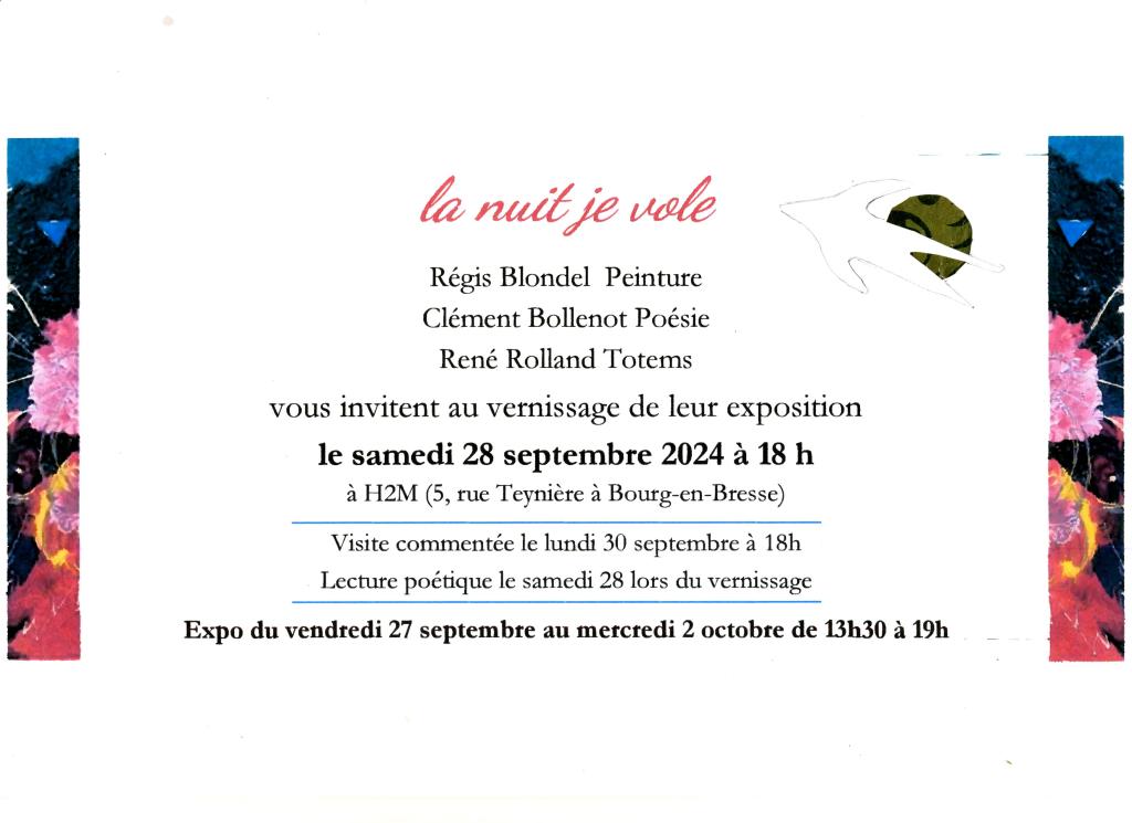 Exposition qui mêle les peintures de Régis Blondel, les totems de René Rolland et des poèmes inédits de Clément Bollenot. Vernissage le samedi 28 septembre à 18h à H2M, 5 rue Teynière à Bourg-en-Bresse.