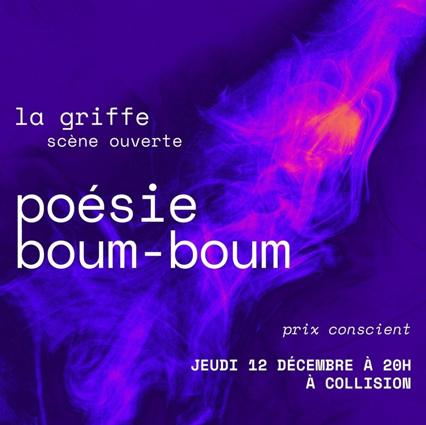 Participation à la 2e scène ouverte la griffe, poésie boum-boum, lectures de textes inédits avec le musicien Bouki, en présence de Radio Bellevue. A partir de 20h à Collision, 18 rue des Tables Claudiennes (Lyon 1er).