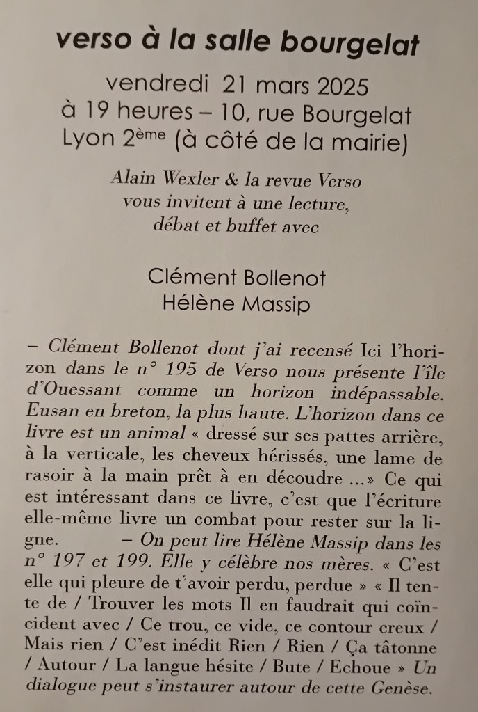 A l’invitation d’Alain Wexler et de la revue Verso : lecture et échanges autour de mon recueil Ici l’horizon publié aux éditions Le Chat Polaire. A partir de 19h, 10 rue Bourgelat (Lyon 2e).
